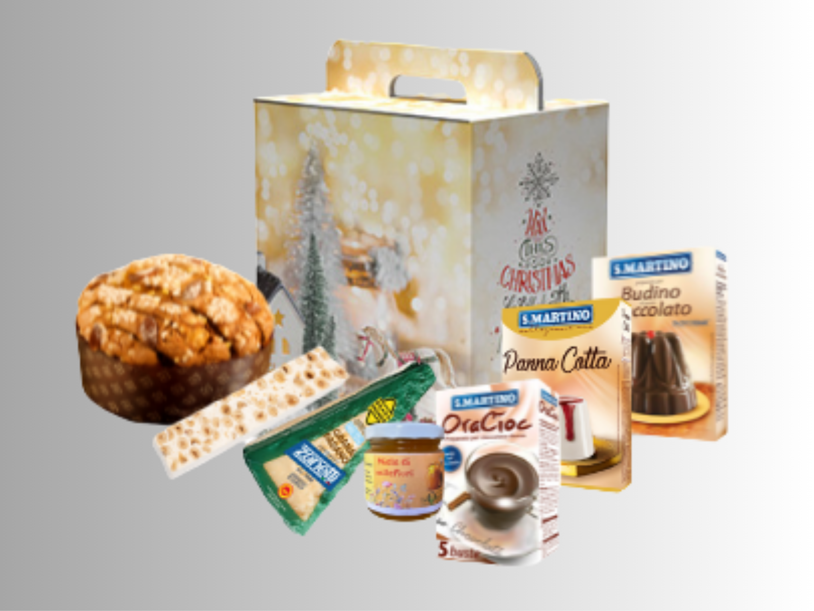 Panettone (750 g) semiartigianale Flamigni, Grana padano Zanetti (300g), Preparato Budino al Cioccolato e Panna Cotta ai frutti di bosco S. Martino, Torrone, una scatola Oro Ciok S. Martino, un vasetto di Miele confezionato dai ragazzi.