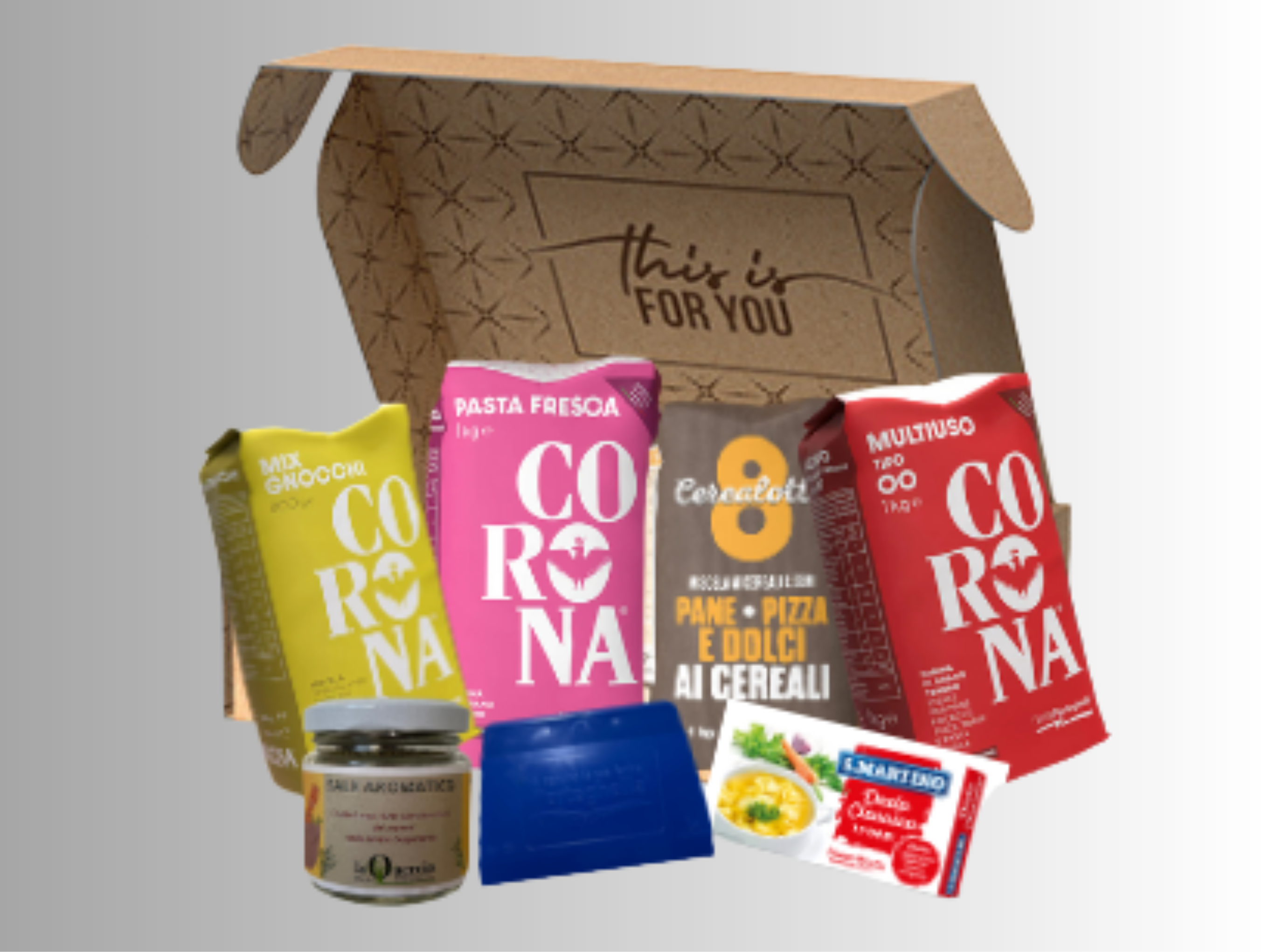 Quattro Confezioni di Farina Molino Perteghella: Corona Mix Gnocchi, Corona Pasta Fresca, Cerealotto, Corona Multiuso. Una Spatolina taglia impasto, scatola Dadi 10 cubetti S.Martino e un vasetto di Sale Aromatico confezionato dai ragazzi.